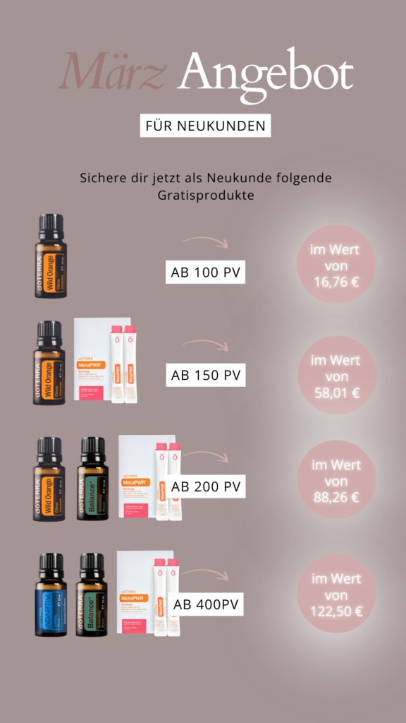 Dies sind die Gratisprodukte im März. Wichtig ist, dass ich die Bestellung für dich tätige! Schreib mir gerne HIER, wie du am liebsten starten möchtest. Im Anschluss findest du die Einsteigersets