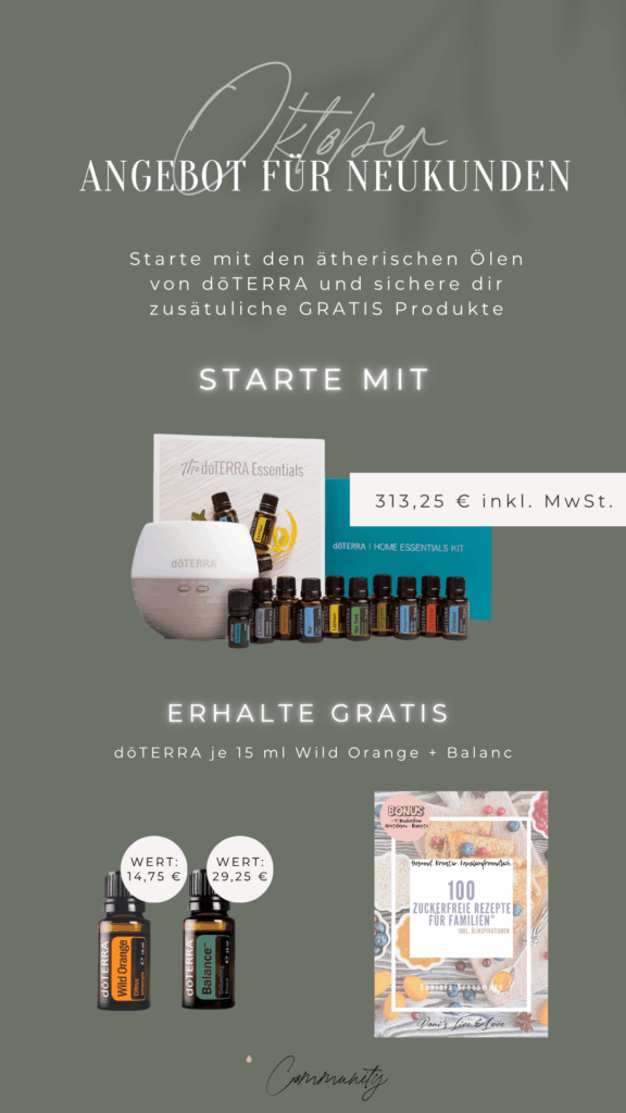 Im Oktober hast du die Möglichkeit bis zu 2 Gratisöle zu bekommen. Je nach dem für welches STARTERSET du dich entscheidest. Schreib mir gerne HIER, damit wir gemeinsam dein Set finden und du auch von den Gratisprodukten provitierst.