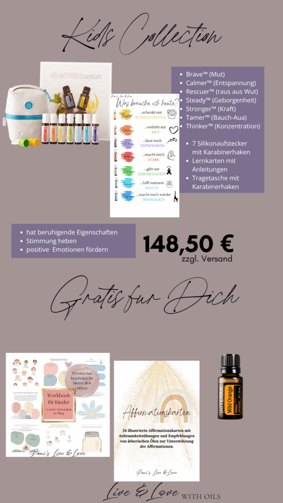 Die Kids Collection ist speziell auf die Bedürfnisse von Kindern abgestimmt. Mit sanften, sicheren und effektiven ätherischen Ölen bietet dieses Kit Unterstützung für die körperliche und emotionale Gesundheit von Kindern. Es enthält kinderfreundliche Öle, die einfach anzuwenden sind und für die ganze Familie geeignet sind.