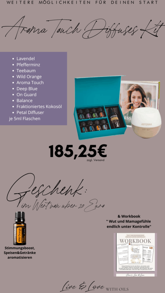 Hier findest du eine Übersicht, wie du in mit den ätherischen Ölen starten kannst. Ich bin damals mit dem Home Essential Kit gestartet, das ich dir sehr ans Herz legen kann. Es enthält die 10 wichtigsten Öle und Ölmischungen, die sich auch „Hausapotheke“ nennt, damit kannst du schon ganz viele Lebensbereiche abdecken. Ausserdem bekommst du einen wunderschönen Kaltwasser-Diffuser mit dazu, der unverzichtbar ist.
