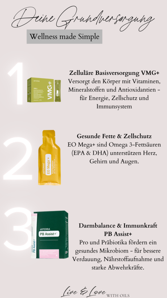 Mit dem Bundle „Wohlbefinden, leicht gemacht“ (ohne Tabletten) hast du die Lösungen für dein Wohlbefinden in praktischen Portionsbeuteln immer griffbereit – ganz ohne Kapseln. Mit VMG+™, EO Mega™+ (Sachets) und PB Assist+™ kommt dieses Bundle ohne herkömmliche Tabletten aus und bietet Effizienz und Komfort mit jedem Sachet.